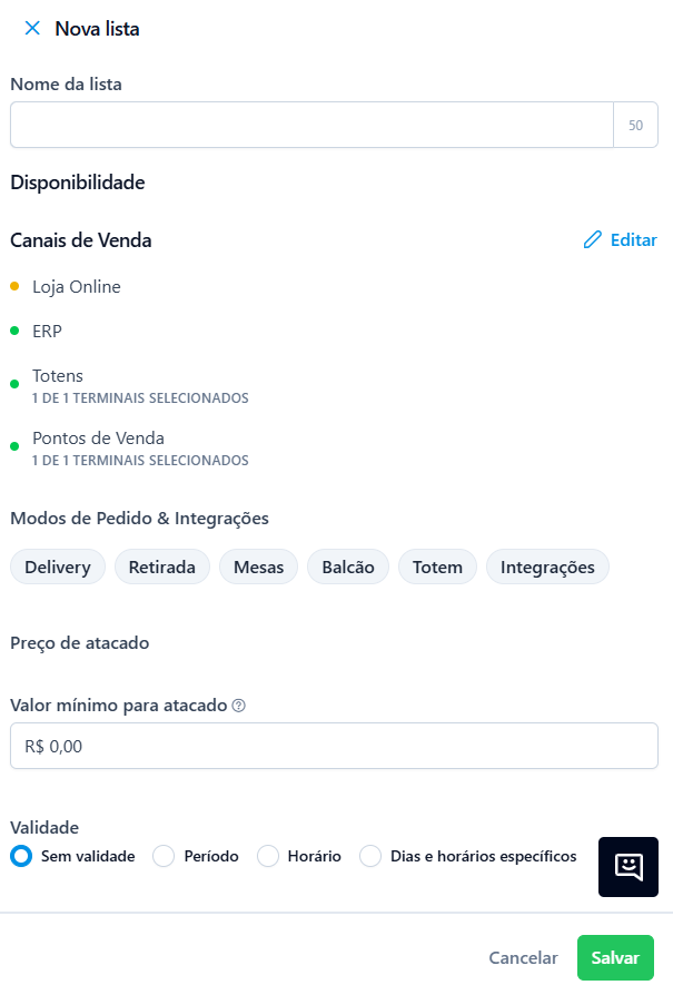 - Canais de Venda: Selecione em quais canais essa lista será ativa (ex: Apenas PDV, Apenas Cardápio Digital).